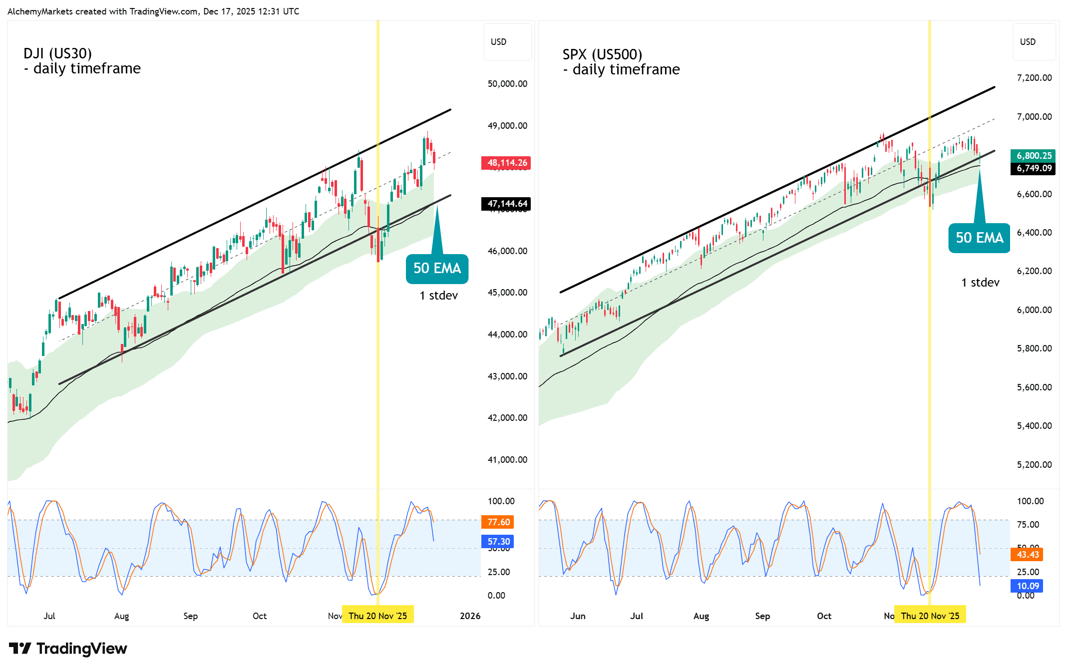 The S&P 500, meanwhile, has shown more volatility near the upper end of its channel, with sharper rejections and heavier reliance on EMA support. Momentum has cooled faster, even though the broader trend remains intact.