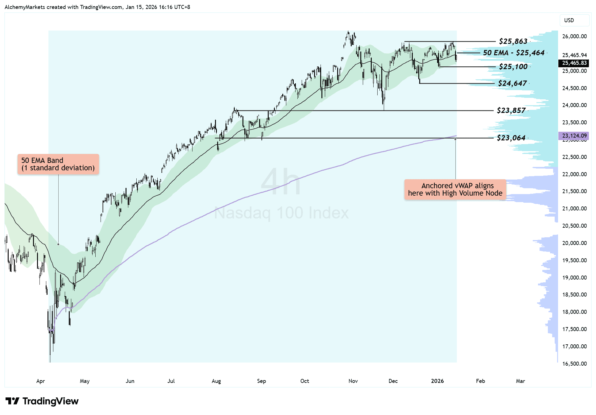 From a market-structure angle, this helps explain why the Nasdaq continues to hold above its 50 EMA band and prior breakout zones instead of mean-reverting deeper. Strong TSMC results reduce the probability of a sharp tech-led unwind and instead favour range digestion or shallow pullbacks.