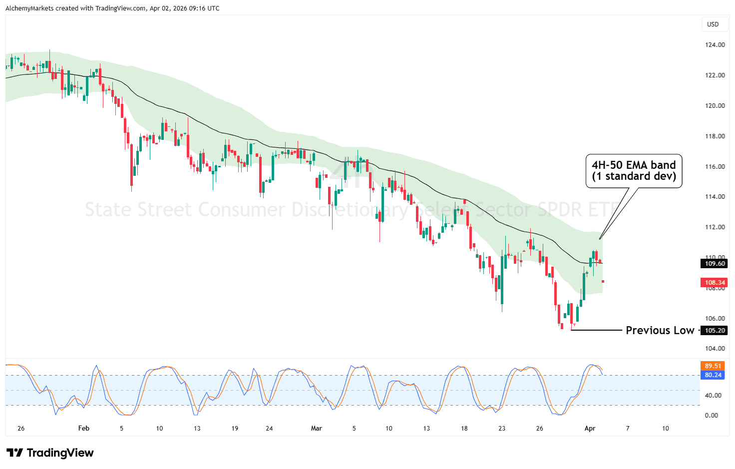 If this were a genuine relief rally, consumer stocks should have pushed higher more cleanly. Instead, XLY is still struggling around the 4H 50 EMA band. Today, it even gapped down.