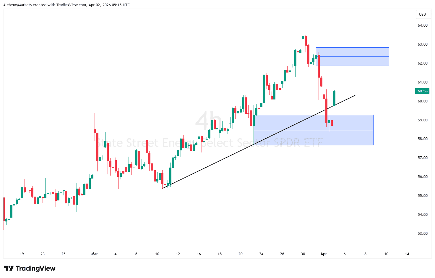 XLE explains the move underneath. Energy only weakened while oil was falling. Once Trump’s tougher message hit, that move reversed quickly. The 4H chart shows exactly that: a sharp drop from the highs, then a fast test of support and a violent gap up as the oil story changed again.