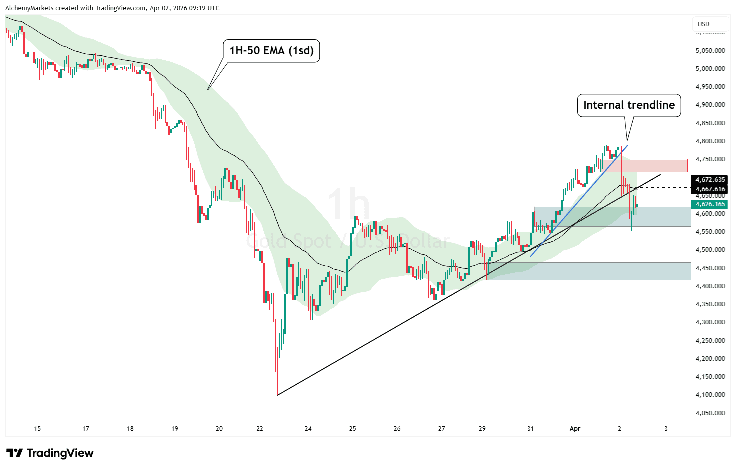 Gold is technically now back under its 1H-50 EMA band, and potentially could remain suppressed as it has in Mid March. The key level to watch now is $4,667, which is the 50 Exponential Moving Average and the point where Gold has broken a larger trendline.