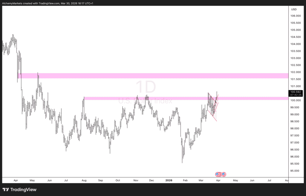 Attention now turns to 102, which stands as the next meaningful resistance level. A continuation of current macro conditions—particularly sustained energy strength and geopolitical uncertainty—would likely provide the catalyst for a test of that level in the near term.
