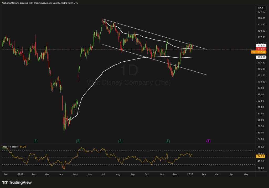 In short: Disney’s chart is constructively wound—the kind of setup that often precedes a range expansion.