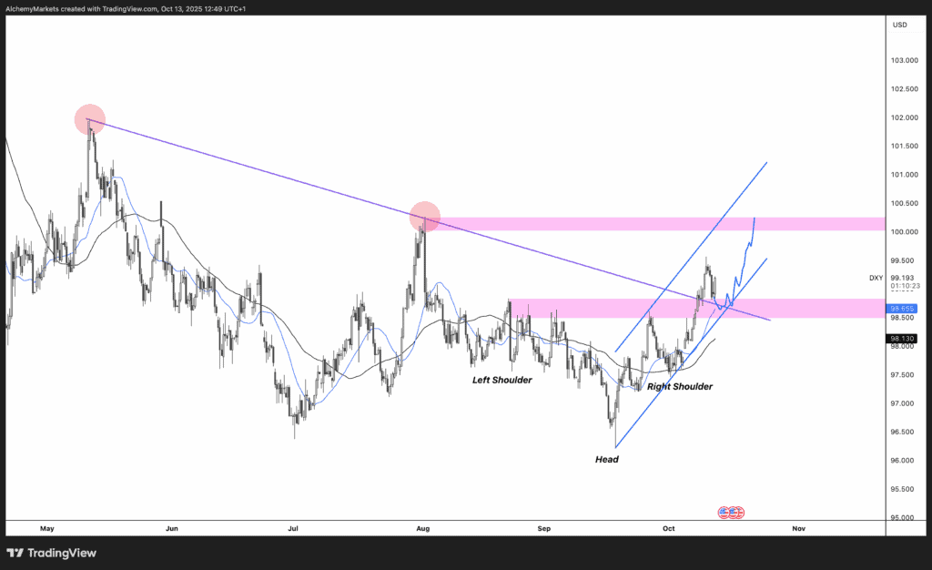 The chart paints a clear inverse head-and-shoulders pattern, signalling a potential reversal from the summer’s downtrend. The neckline breakout above 98.50–98.70 support confirms renewed buying strength, reinforced by the 20- and 50-day moving averages now trending higher.