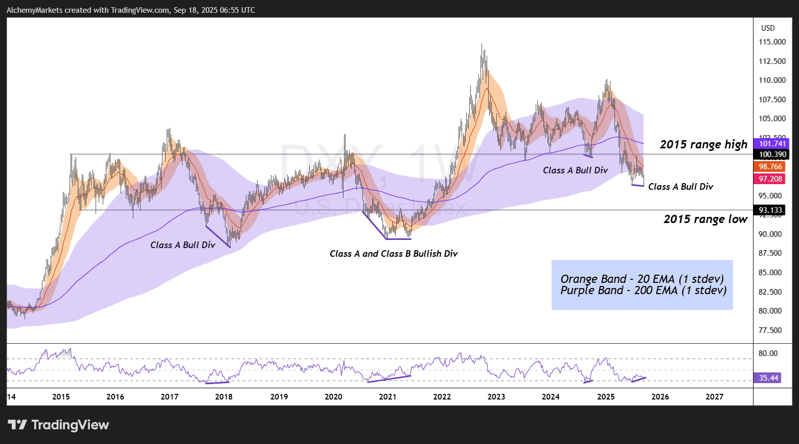 The playbook is clear: divergence suggests the dollar may be trying to base, but the Fed’s pivot has tilted conditions against it. Just as in 2008–2012, when the 200-EMA band capped every rebound until finally broken, the DXY could stay pinned beneath resistance unless it reclaims that dynamic barrier. Until then, the easing cycle and the weight of both EMA bands argue that dollar strength remains capped—even if short-term squeezes materialise.