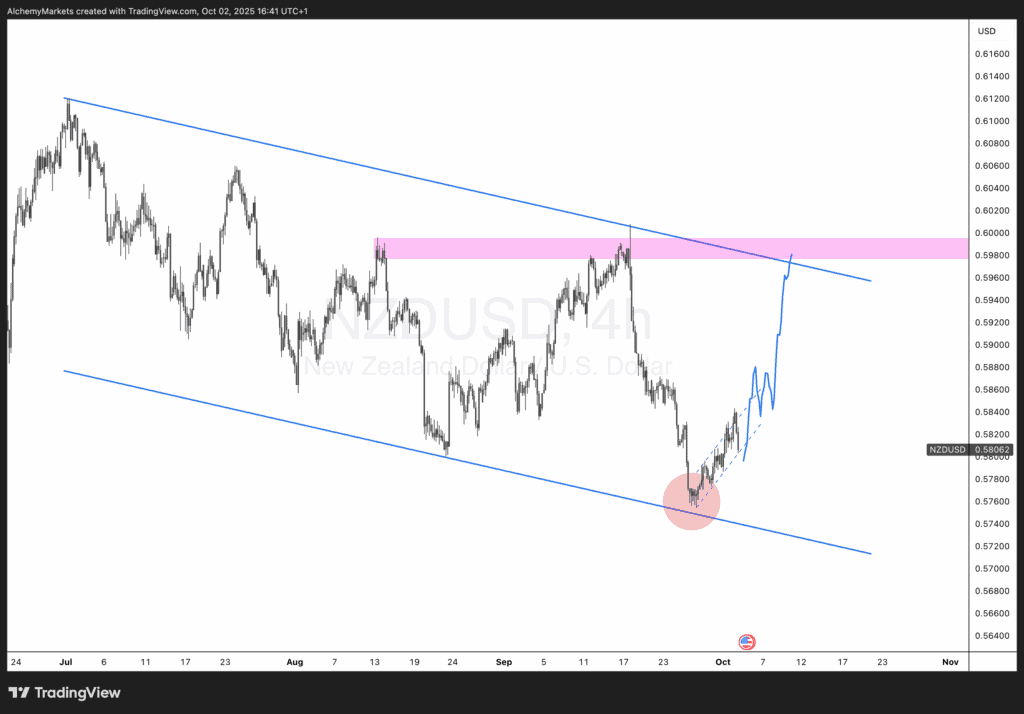 Looking at the 4-hour chart, NZD/USD has been locked inside a descending channel since July, reflecting the broader downtrend. Recently, price touched the channel’s lower bound near 0.5750, where it found strong buying interest.