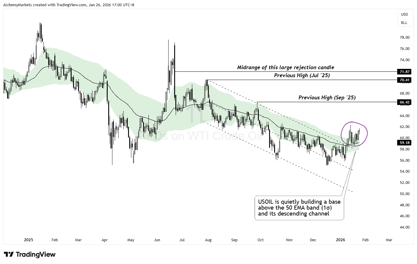 For most of the second half of 2025, rallies in oil were sold aggressively at the channel top, daily 50-EMA, and at the top of the EMA band (set to 1 standard deviation). That pattern is now broken.