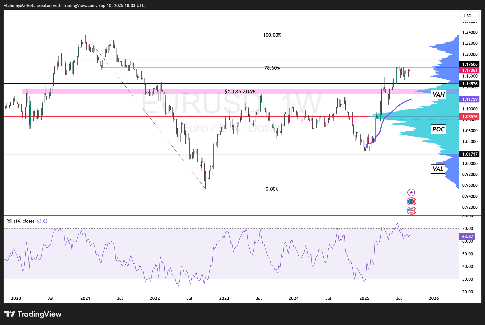 On the weekly timeframe, EUR/USD is now testing the $1.1760 / $1.1780 zone. This level carries weight: it marks the breakdown point from March 2021 and coincides with the 78.6% fib retracement of the 2021–22 decline. It has acted as a ceiling before, and the market is now probing it again.