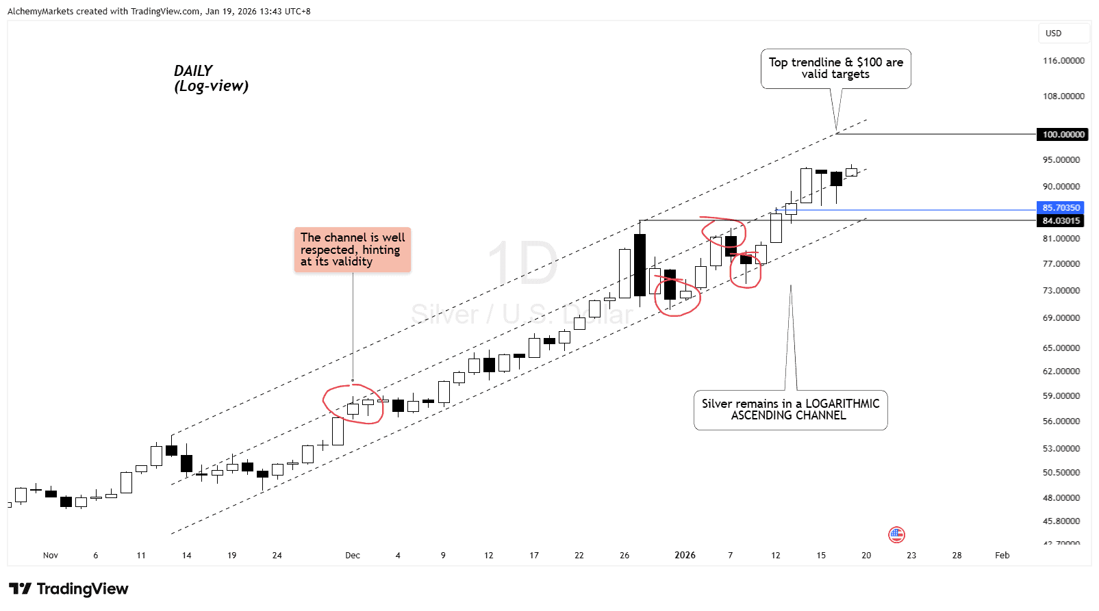 Silver’s Secret Rising Channel (Daily) — $100 and $85 in Sight