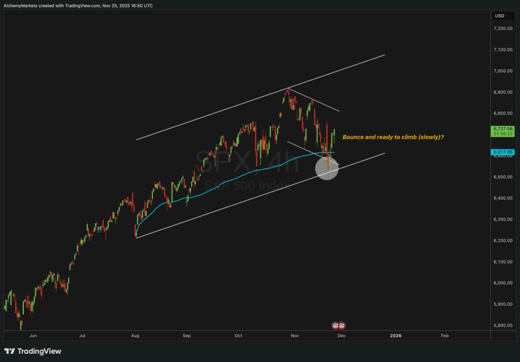 SPX is back at a familiar spot — the lower end of its channel — and this time, it looks like buyers have shown up again. The price action bounced cleanly off support after a brief flush, reclaiming both the channel line and the 4h trend level. It’s not a rocket-style move, but it’s firm enough to suggest a slow grind higher might be underway.