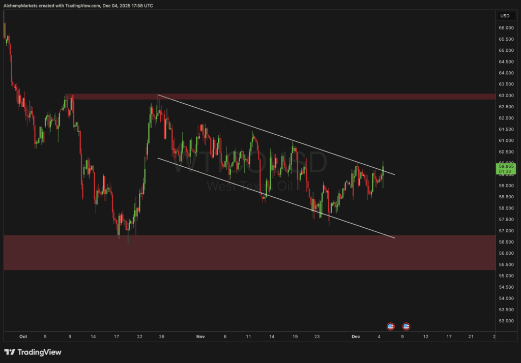 For much of the past month, oil has been trapped between lower highs and lower lows, moving steadily within a descending channel. This week’s breakout above that upper boundary suggests a shift in sentiment.