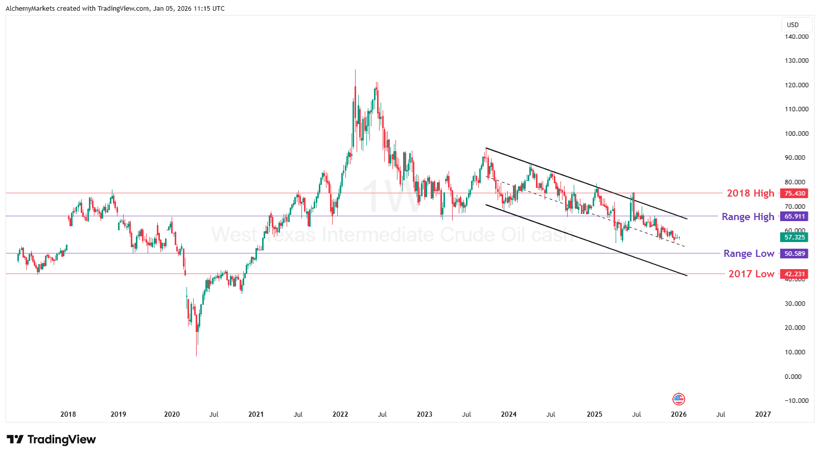 The market is not pricing a sudden Venezuelan supply surge. It’s pricing uncertainty, with a slight downside bias as expectations of future supply linger. If Venezuela headlines were truly bullish for crude, WTI would not still be grinding lower near range support.