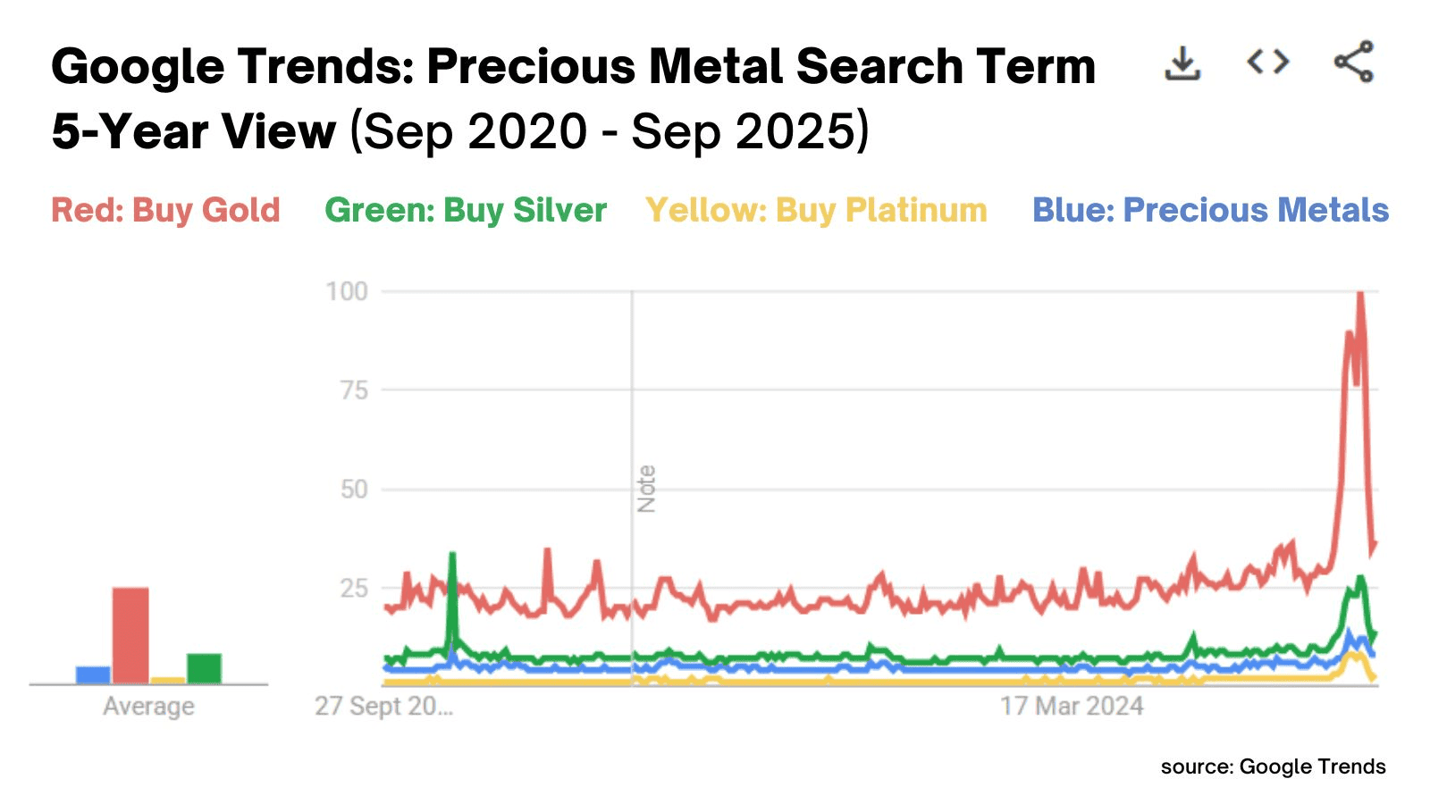It isn’t just institutions and industry. Retail curiosity is exploding too. Google Trends shows searches for “buy gold,” “buy silver,” “buy platinum,” and “precious metals” at multi-year highs.