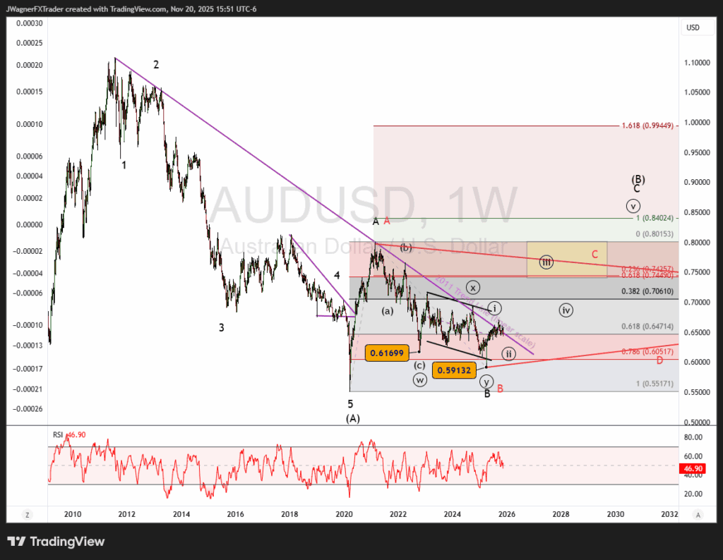 Bigger picture, the low in 2025 appears to be the end of wave B of (B). The rally since April 2025 is the first portion of wave C of (B).