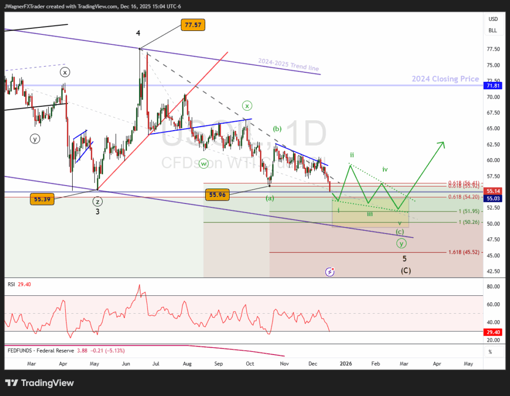 Crude oil appears to be nearing the end of a large ending diagonal pattern that began September 2023. We estimate a downside target, using Elliott wave principles, to be $49.00 – 54.20.