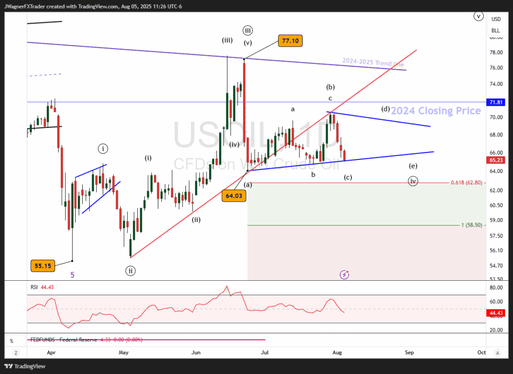 Crude oil appears to be nearing the end of wave (c) of ((iv)), a symmetrical triangle. Once the triangle pattern is completed, then a rally is anticipated to retest $77.10.
