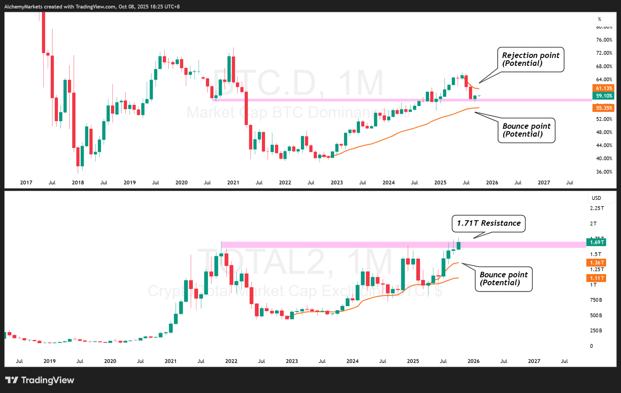 Altcoin market cap is now grinding against critical resistance again at $1.71 trillion, while Bitcoin Dominance (BTC.D) appears to be bouncing from multi-month lows.