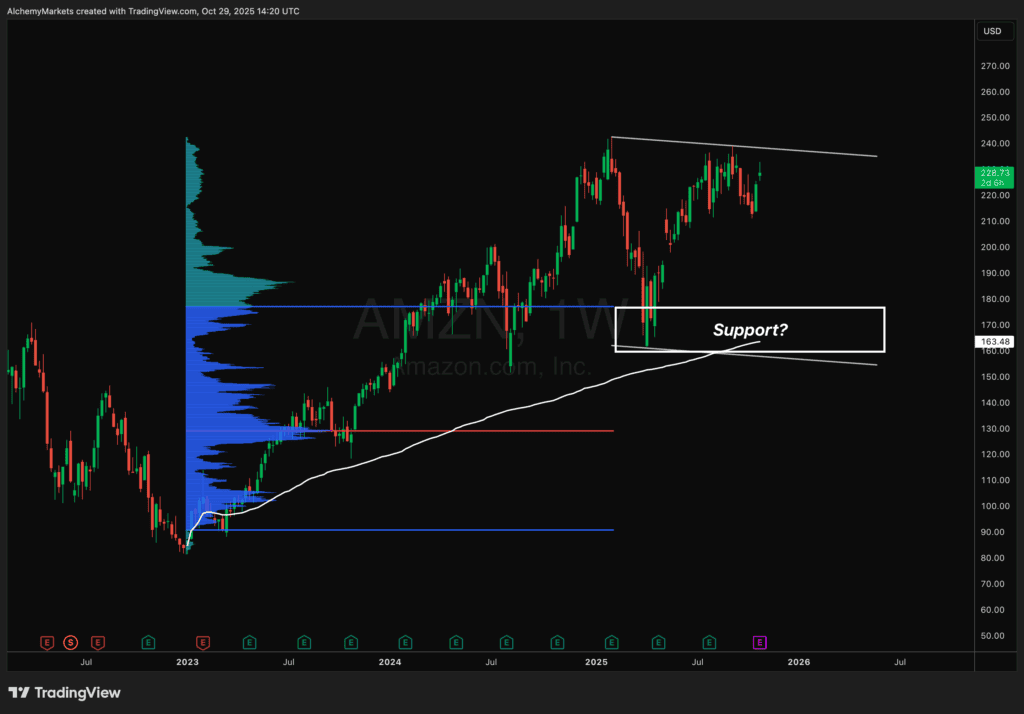 A miss on both top and bottom lines combined with weaker guidance could cause a re-rating to the downside. In that case, Amazon might revisit deeper support zones—around $160, which aligns with your horizontal support, POC from the larger volume profile, anchored VWAP, and lower trend channel.