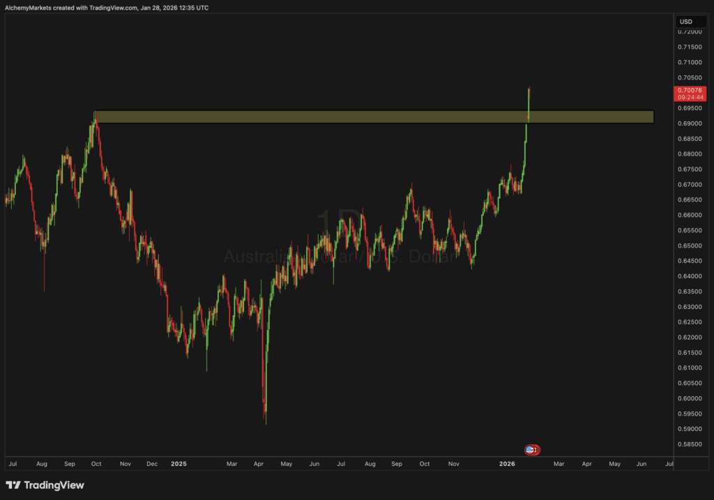 The Australian Dollar (AUDUSD) responded sharply, breaking through the key 0.69 resistance and touching 0.70 for the first time in over a year. The pair has rallied aggressively as traders anticipate a more hawkish tone from the RBA next week.