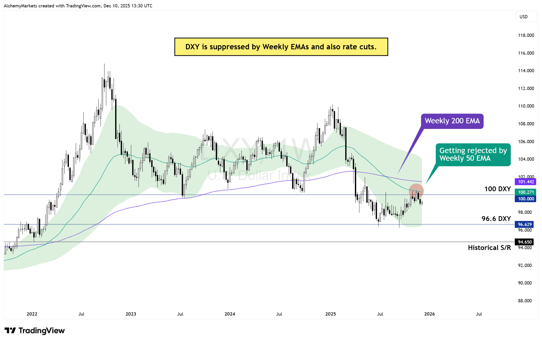 - DXY is being rejected at the 50-week EMA, unable to reclaim trend control.