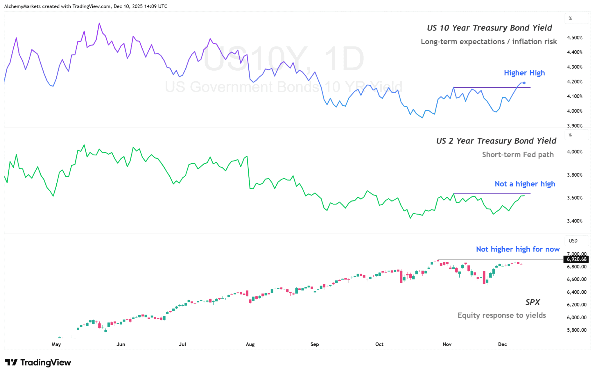 SPX has been chopping sideways while both 2Y and 10Y creep higher—a market in wait-and-see mode, unsure whether to price in disinflation or fiscal anxiety.