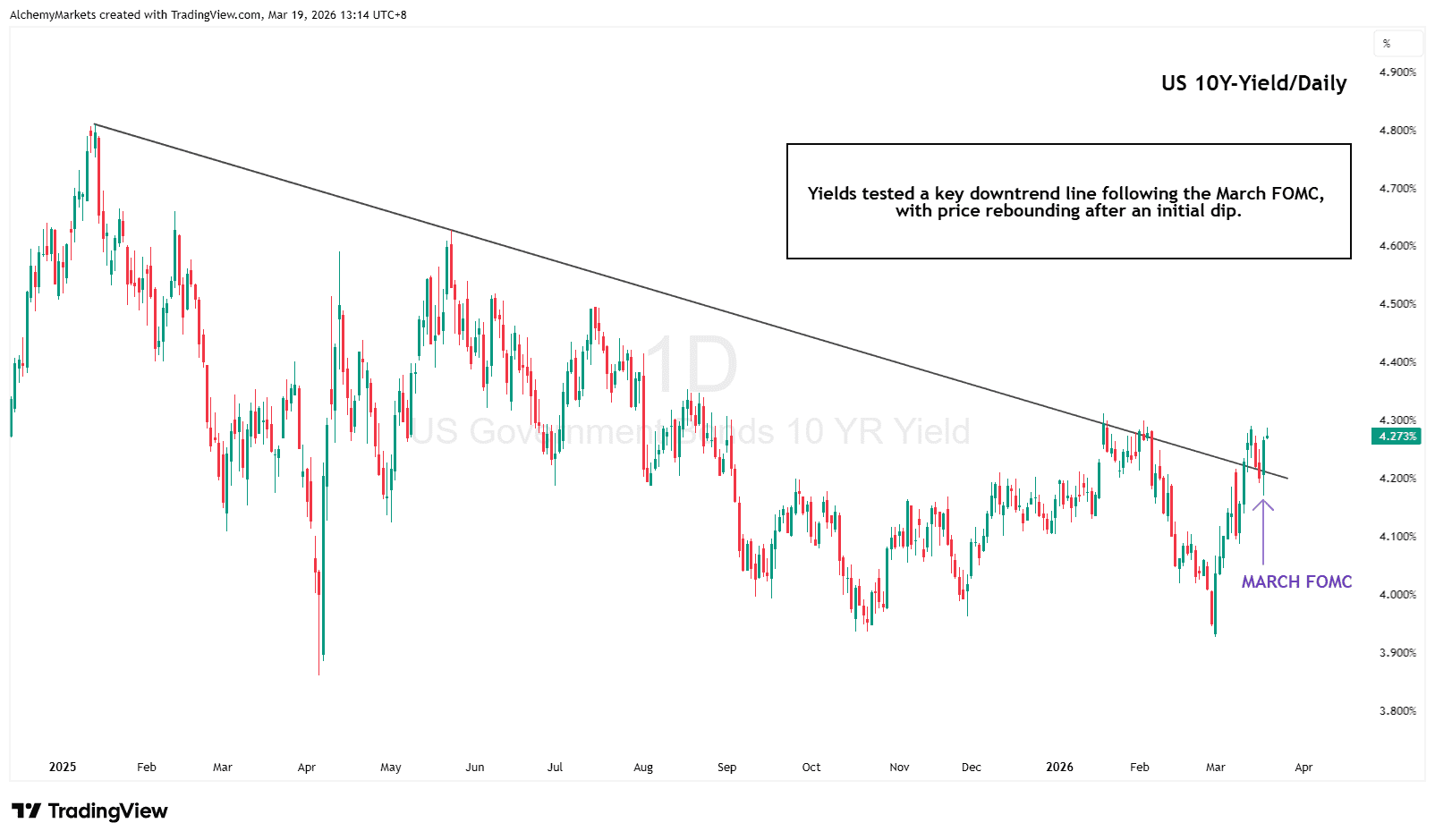 Following the FOMC, yields briefly declined before finding support along the broader trendline structure and reversing higher. This behaviour reflects a reassessment of inflation persistence.