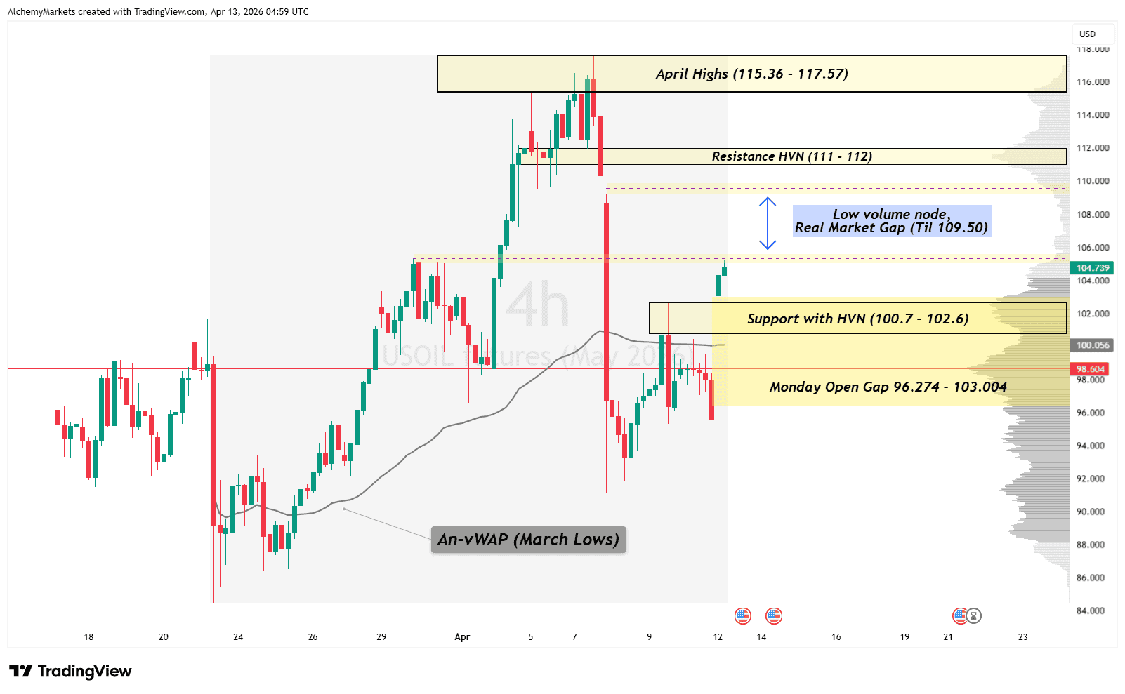 If price cuts through that $105 area, the low-volume zone above could let oil travel faster than usual. That matters because the LVN overlaps with a real gap on the futures chart, and gap areas can offer very little friction when a strong headline is doing the pushing. Above that, the nearest meaningful resistance is around $111 to $112, then higher resistance comes in from roughly $115.3 and upward.