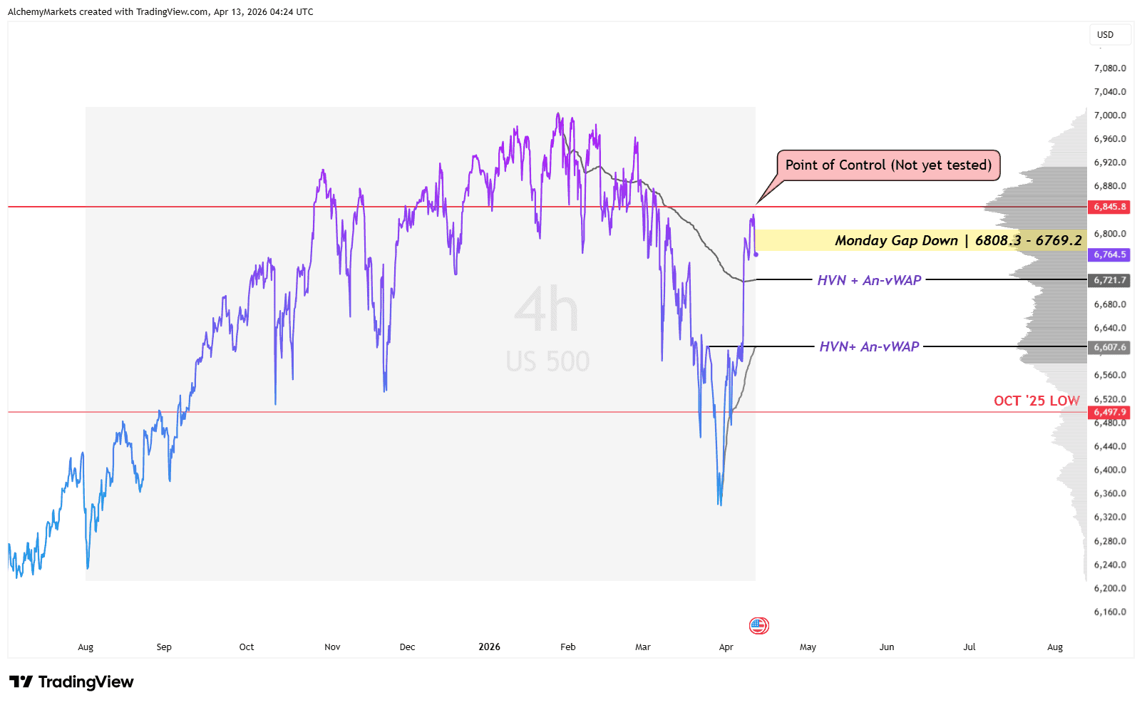 On the US500 4H chart, the Asia open gave us the reaction straight away with a gap down. Last week, the market still looked capable of grinding a bit higher into the 6,850 Point of Control, which is the highest-traded volume area since the August 2025 lows. That move is not fully dead yet, but it is harder to argue for now because price first has to work through the 6,808 gap with fresh bearish news sitting behind it.