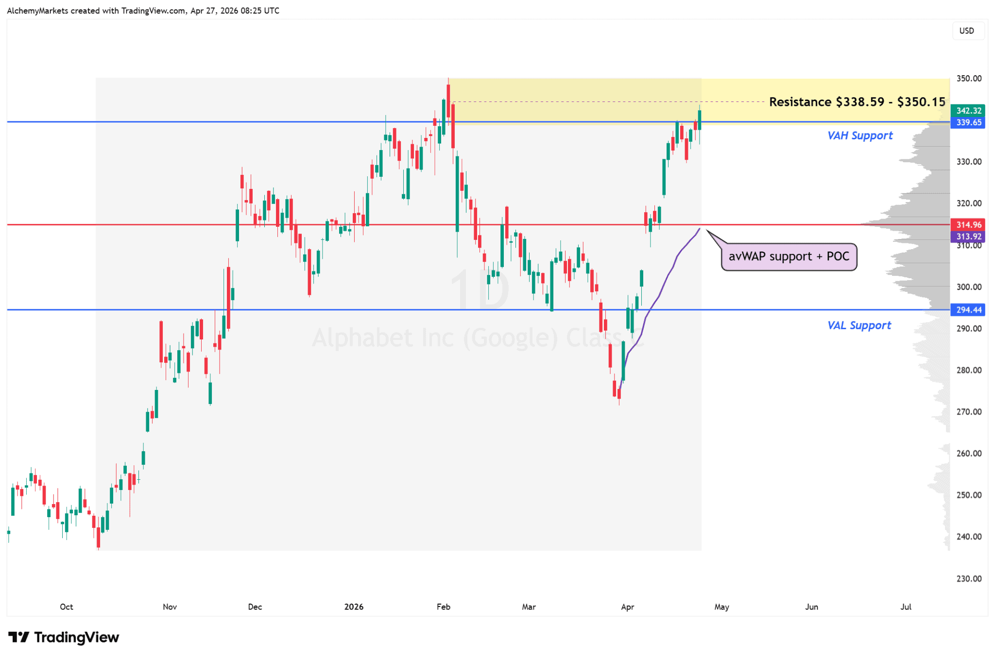 If Alphabet falls back below that area and starts trading inside the previous range again, the breakout attempt loses quality. The next major magnet sits near $314, where anchored VWAP and point-of-control support are closely aligned around $313.92–$314.96.