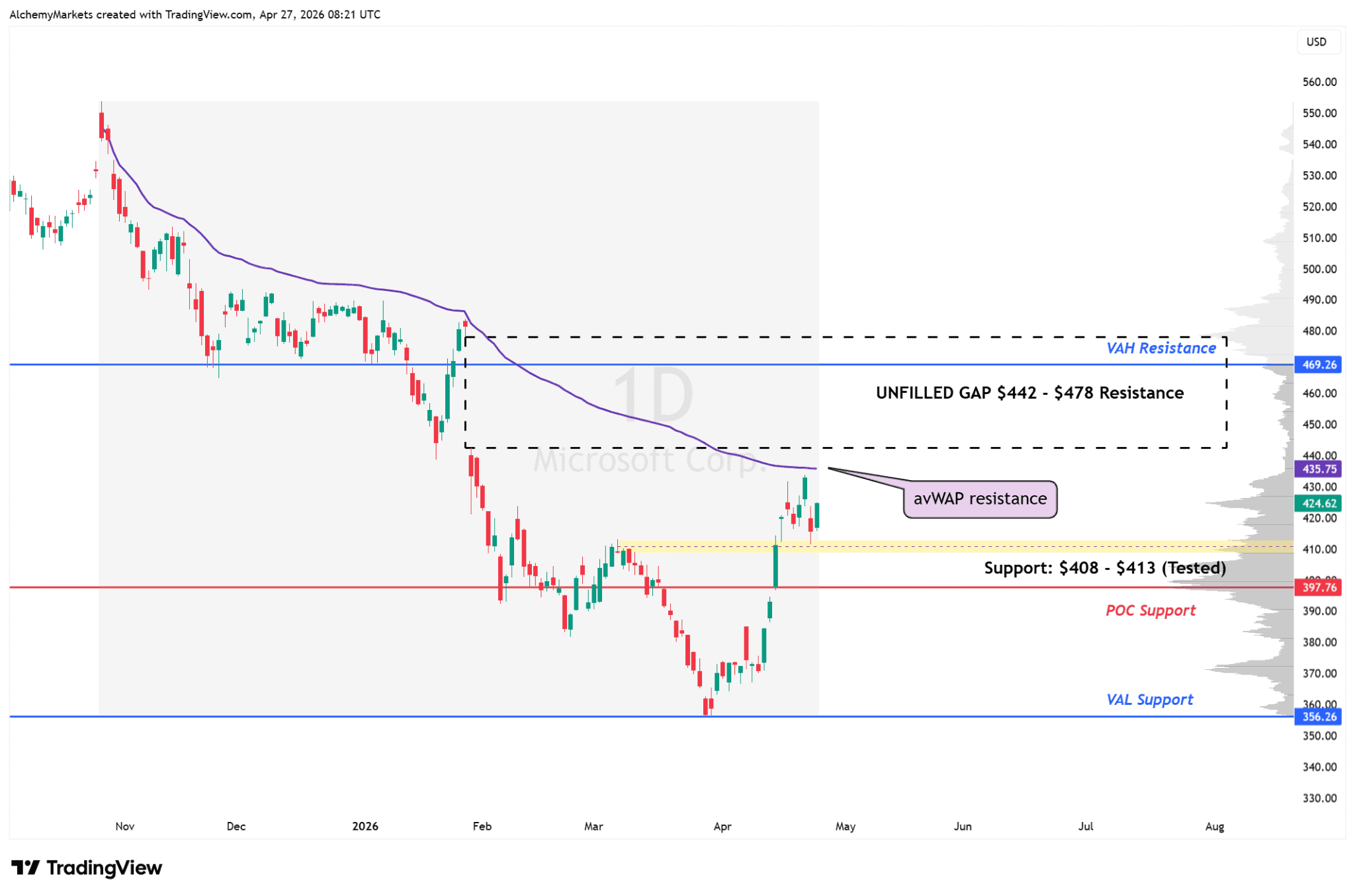 A reclaim of $435–$436 would open the door toward the large unfilled gap between $442 and $478. That gap is where the stock previously dropped quickly, so some trapped sellers may use a move back into that area to exit.