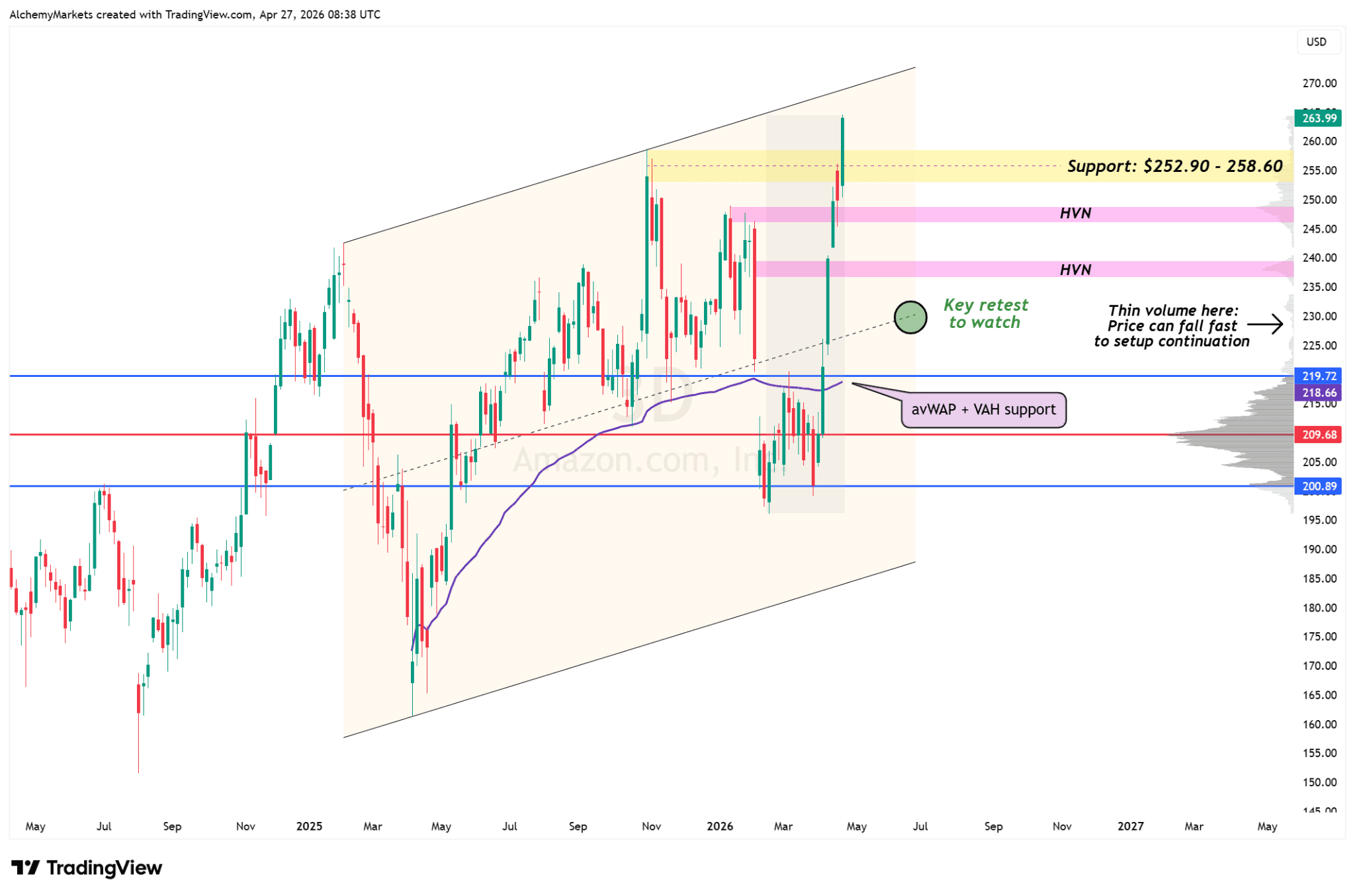 Amazon has pushed above the $252.90–$258.60 zone. That area now becomes the first support area to monitor. Holding above it keeps the breakout in decent shape.