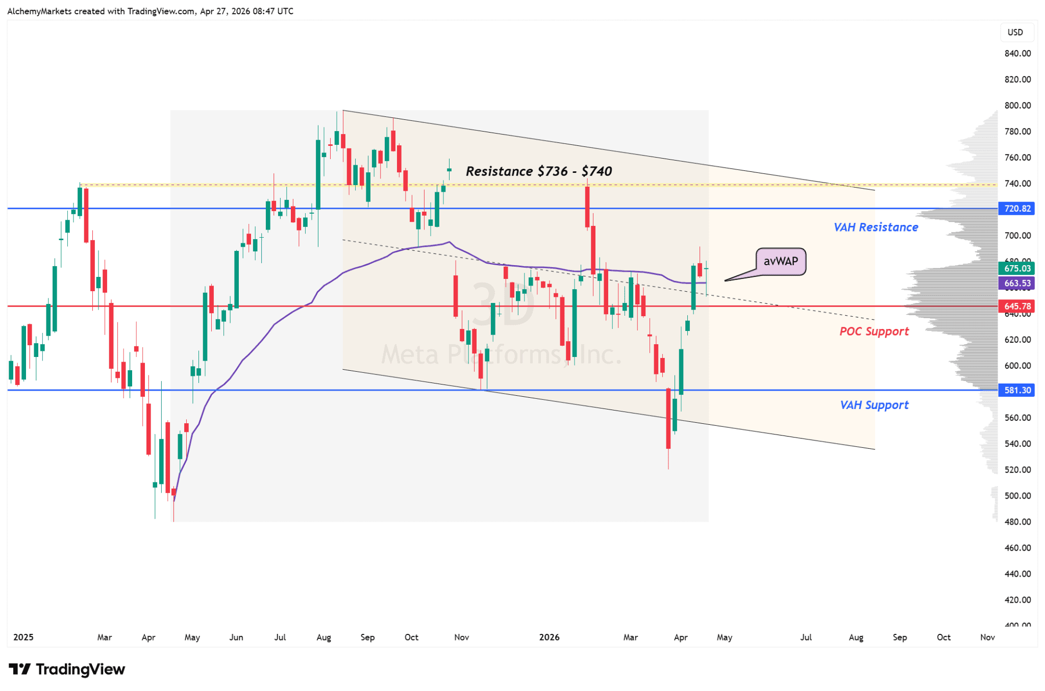 The next test is overhead resistance. The first major level is around $720.82, followed by the larger $736–$740 zone. Until Meta clears that area, the stock still looks like a strong recovery inside a wider range rather than a clean breakout.