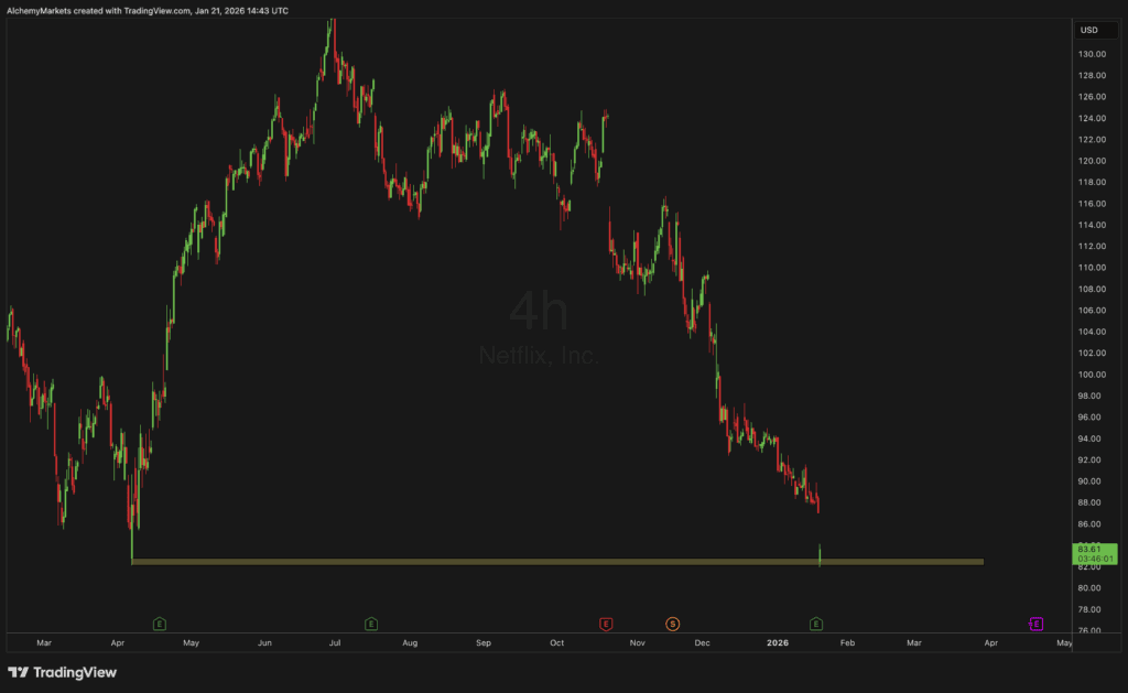 Netflix shares opened sharply lower this morning, gapping down toward a key technical support level near $83.50, despite posting record quarterly results and issuing upbeat forward guidance. The stock has been under pressure for several weeks, sliding nearly 35% from its November highs, as investors weigh strong fundamentals against macro uncertainty and the looming impact of its Warner Bros. acquisition.