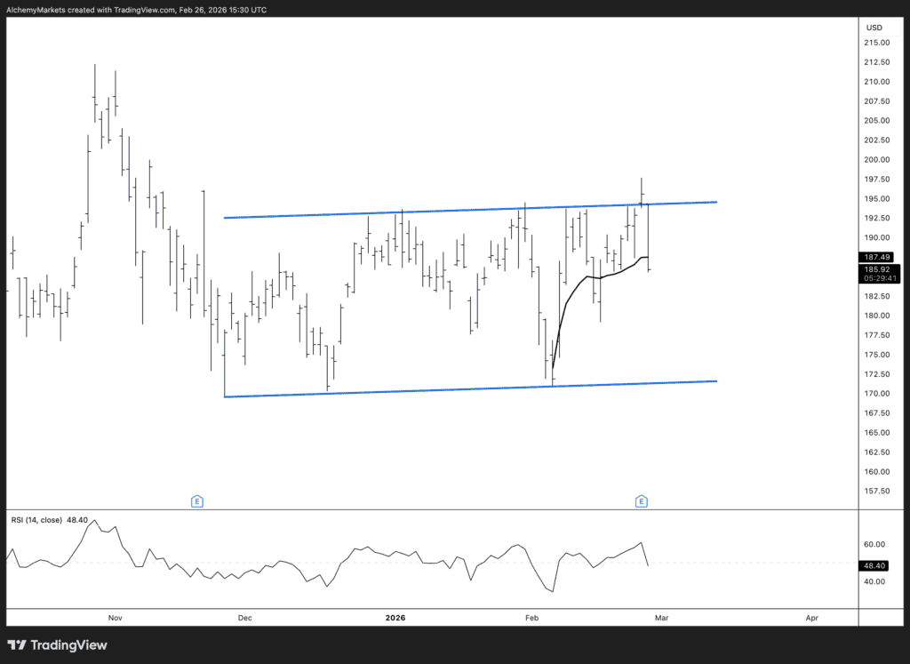 Price is now pulling back from the upper bound of that channel — the same area that has capped prior rallies. The recent sell-off is occurring near that resistance, not after a breakdown, which suggests supply is appearing at known technical levels.