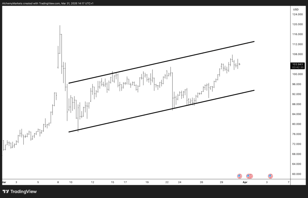 Oil is pulling back slightly this Tuesday morning, but the broader picture remains firmly bullish. Brent is holding around $107 a barrel after a massive March rally, up roughly 60% on the month. That kind of move is rare — and it’s being driven almost entirely by geopolitical risk.