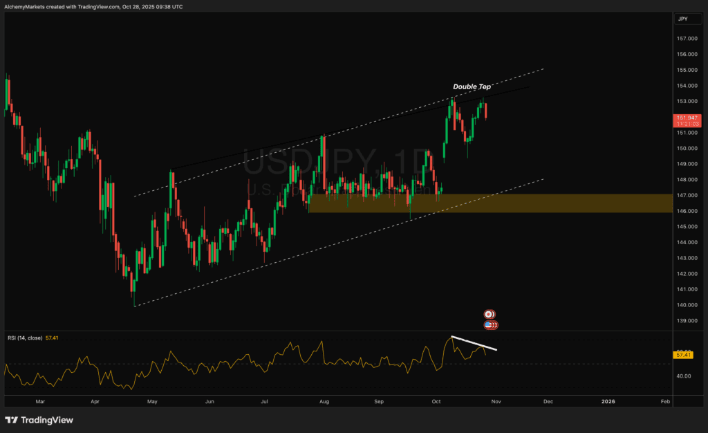 Technically, USD/JPY has carved out a double top pattern support by RSI divergence just below the 154.00 mark, suggesting potential exhaustion in the recent uptrend. The pair continues to trade within an ascending channel, but momentum looks to be fading near the upper boundary.