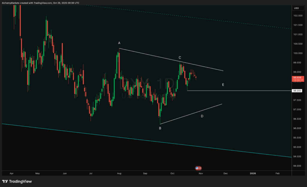 A break below that zone could open the door for further downside, but for now, DXY remains in a technical squeeze between lower highs and higher lows. The pattern suggests the dollar is waiting for a clear catalyst — either stronger U.S. data or a shift in global monetary tone — to define its next leg.