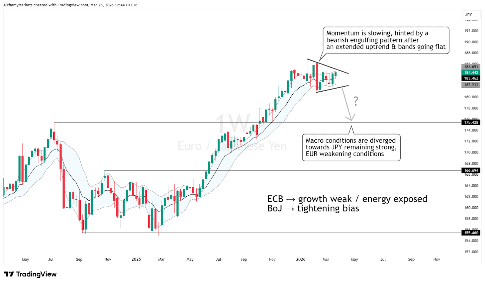 EURJPY looks like one of the strongest expressions in the whole report. The macro split is obvious: ECB growth fragility versus BoJ tightening bias. On the chart side, momentum has slowed after an extended move higher, and bearish rotation risk would rise if rallies start failing into resistance. This is the sort of pair where macro divergence and structure can work together rather than against each other.