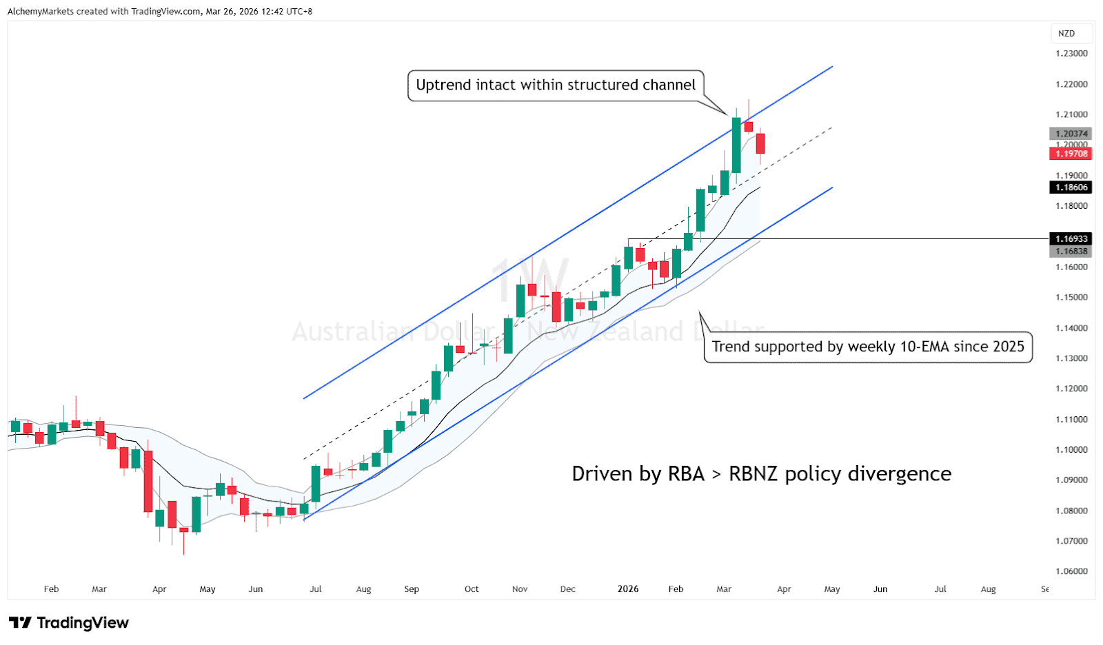AUDNZD is the clearest trend expression in the commodity complex. The pair remains in a structured uptrend, the weekly EMA has repeatedly acted as support, and the macro driver is straightforward: RBA policy looks firmer than the RBNZ after the March hike. This is one of the few places where the quarter still offers a relatively clear directional divergence trade.
