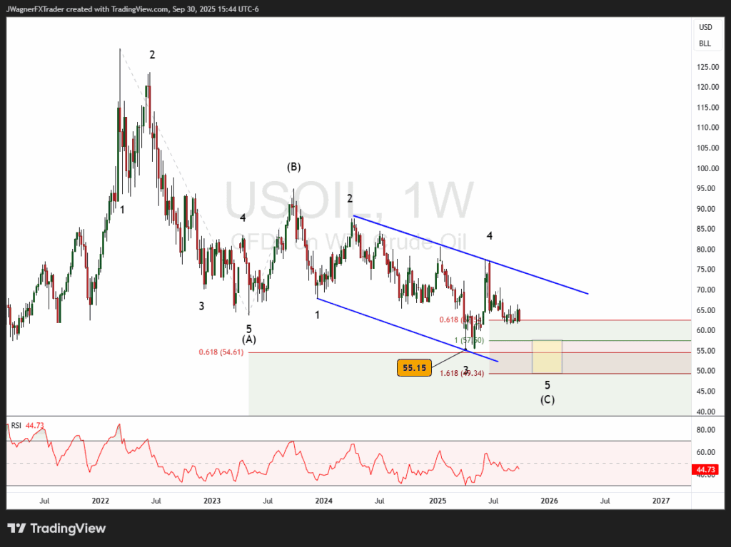Crude oil has been no stranger to the roller coaster ride. The rally from the April 2025 low does not have the look of a motive pattern. Therefore, the odds of revisiting the $55 low is high.