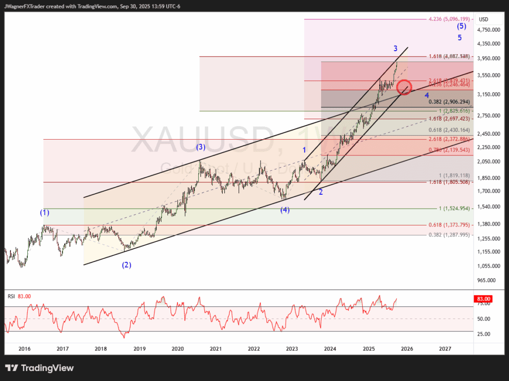 If gold prices do correct lower in wave 4 of (5), we anticipate support may emerge between 2,900 to 3,250 (red circle on chart above). Those levels coincide with previous fourth waves and are flanked by Fibonacci retracement ratios from wave 3.