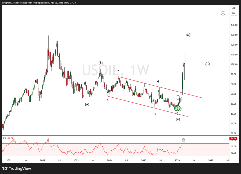 Crude oil did find a secondary low on January 7 at $56.59, then began its rally culminating in a spike higher in early March as the Iran conflict heated up.