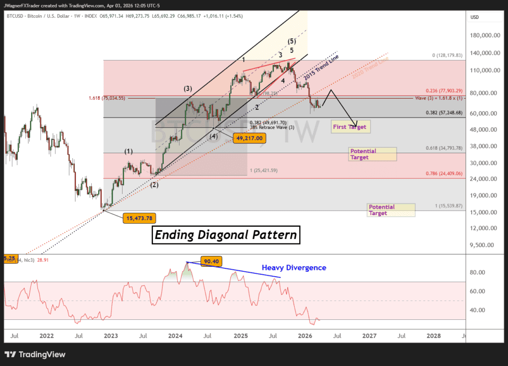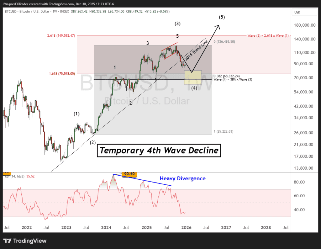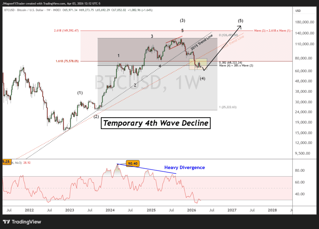 Once the countertrend bounce is complete (likely in Q2 2026), then this Elliott wave model suggests another decline towards the $49k target or lower levels.