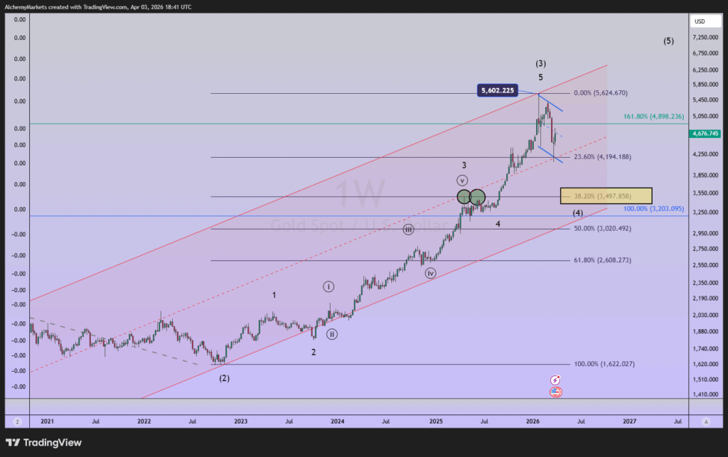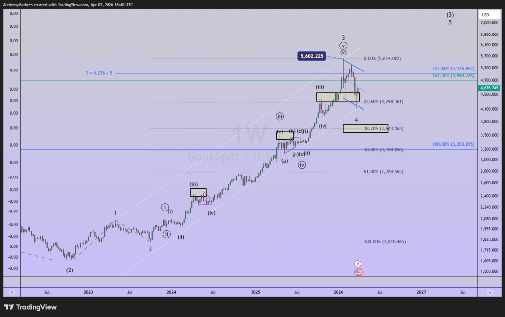 Prior to the conflict erupting, we did anticipate a large decline. Our Q1 2026 forecast was anticipating a top in wave 3 that leads to a wave 4 consolidation. In the Q1 report, we anticipated that wave 4 may find support in the 3,800-4,200 price range. Gold reached a low of 4,099 in March.