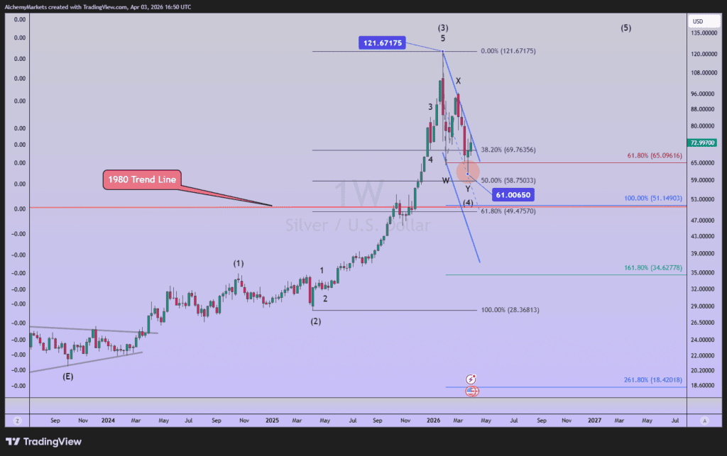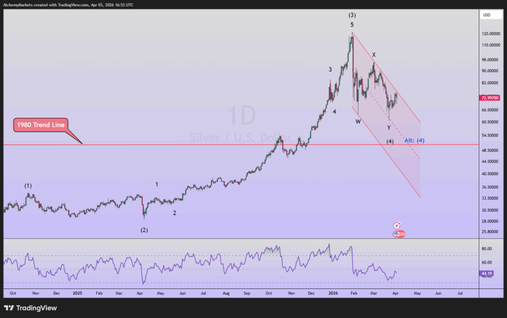 The big picture to remember for gold is that this Q1 decline was all or part of wave 4 of a larger 5 wave bullish sequence. This implies we’ll eventually see new highs above $5,600 in the coming quarters.