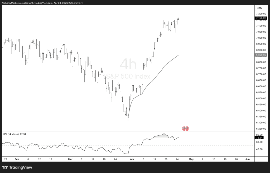 From a technical standpoint, the S&P 500 continues to trade in a strong short-term uptrend on the 4-hour timeframe, with price action printing a clear sequence of higher highs and higher lows since the March 30th low (~6,320 area).