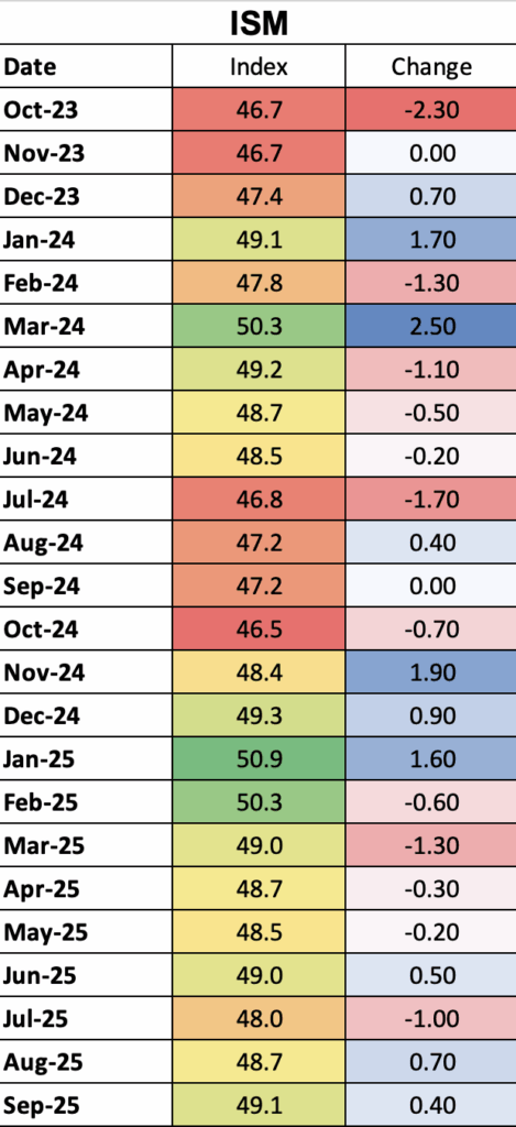 - Monday, Nov 3: ISM Manufacturing PMI (Oct) — expected near 49.0, signaling continued contraction.