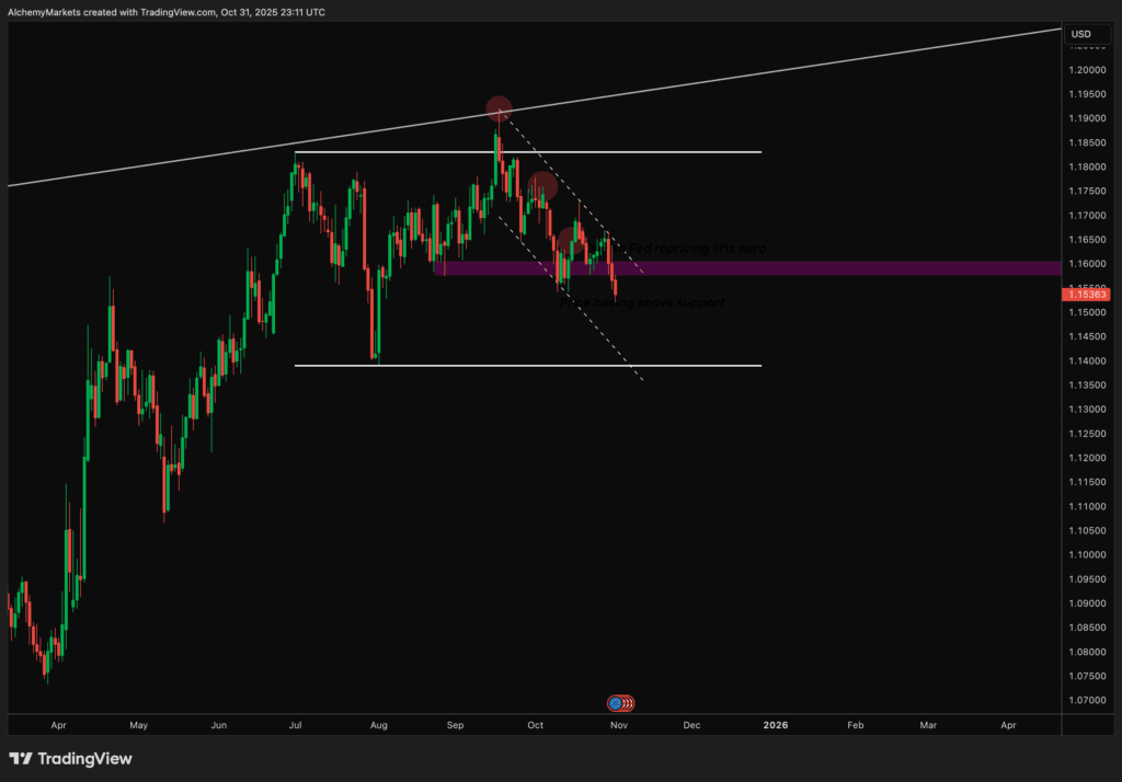 The euro has slipped decisively below the 1.1600 handle, a level that’s acted as a crucial technical pivot for months. The move follows a week of broad dollar resilience and renewed repricing in Fed rate expectations — and it comes just days before a heavy run of U.S. economic data that could dictate the next major swing.