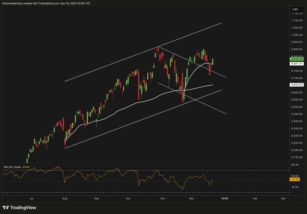 The S&P 500 remains firmly within its ascending channel, suggesting that the broader uptrend remains intact. The chart indicates that the index is currently consolidating near mid-channel but is showing signs of regaining upward momentum.