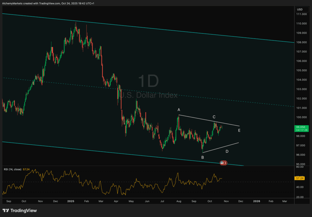Currently, the index trades near 98.96, sitting midway within the triangle. The pattern’s upper boundary (around 99.50) represents near-term resistance, while the lower boundary (near 97.20–97.50) serves as key support.